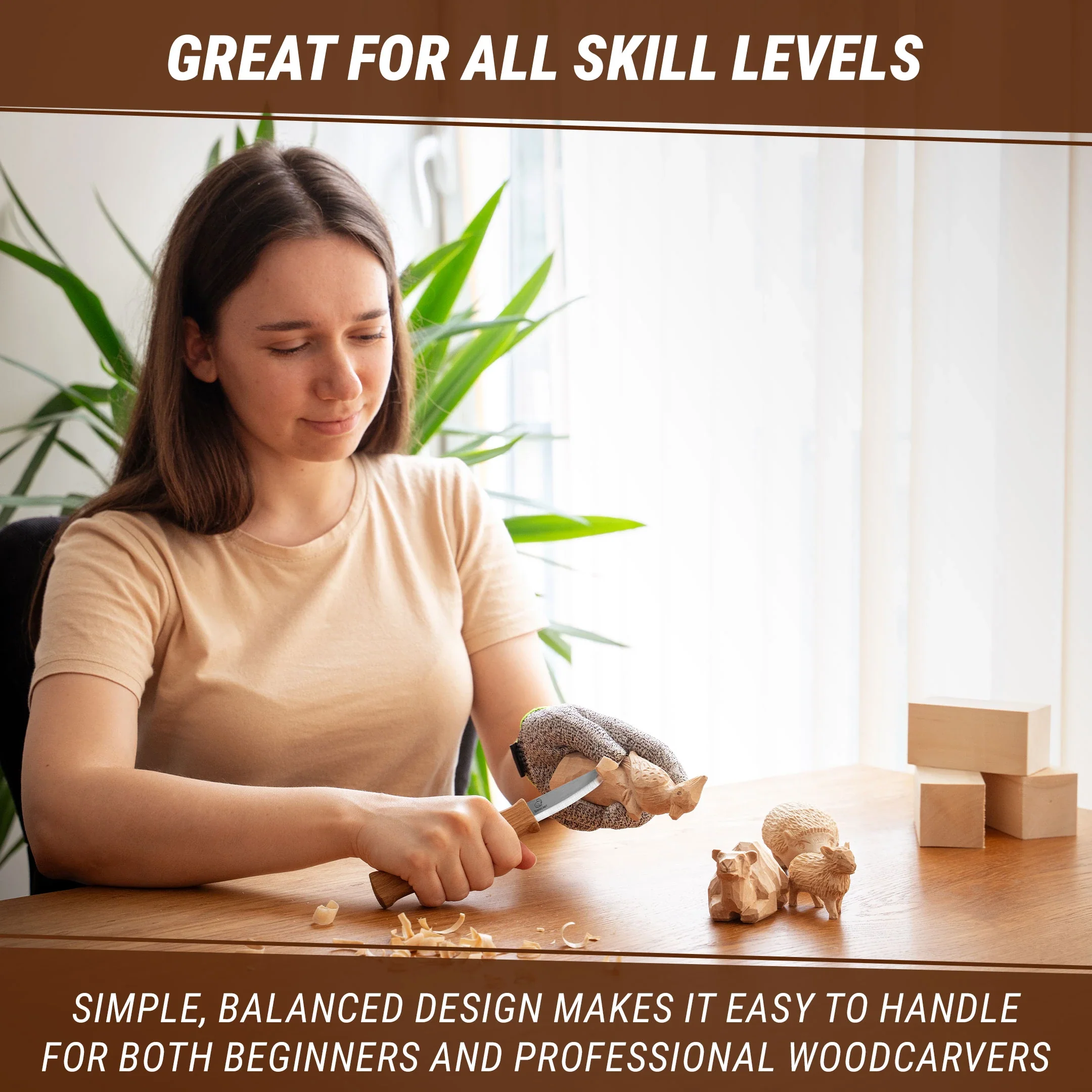 Das Schnitzmesser C4 eignet sich hervorragend zum Schneiden und Schruppen von Holz. Das Messer verfügt über eine gerade Klinge mit einer abgerundeten, haltbaren Spitze für eine stärkere Materialabtragung. Sie können weiches und hartes Holz schneiden. Mit diesem Sloyd-Messer können Löffel, Schaufeln, Spazierstöcke, Schleudern und mehr ausschneiden.