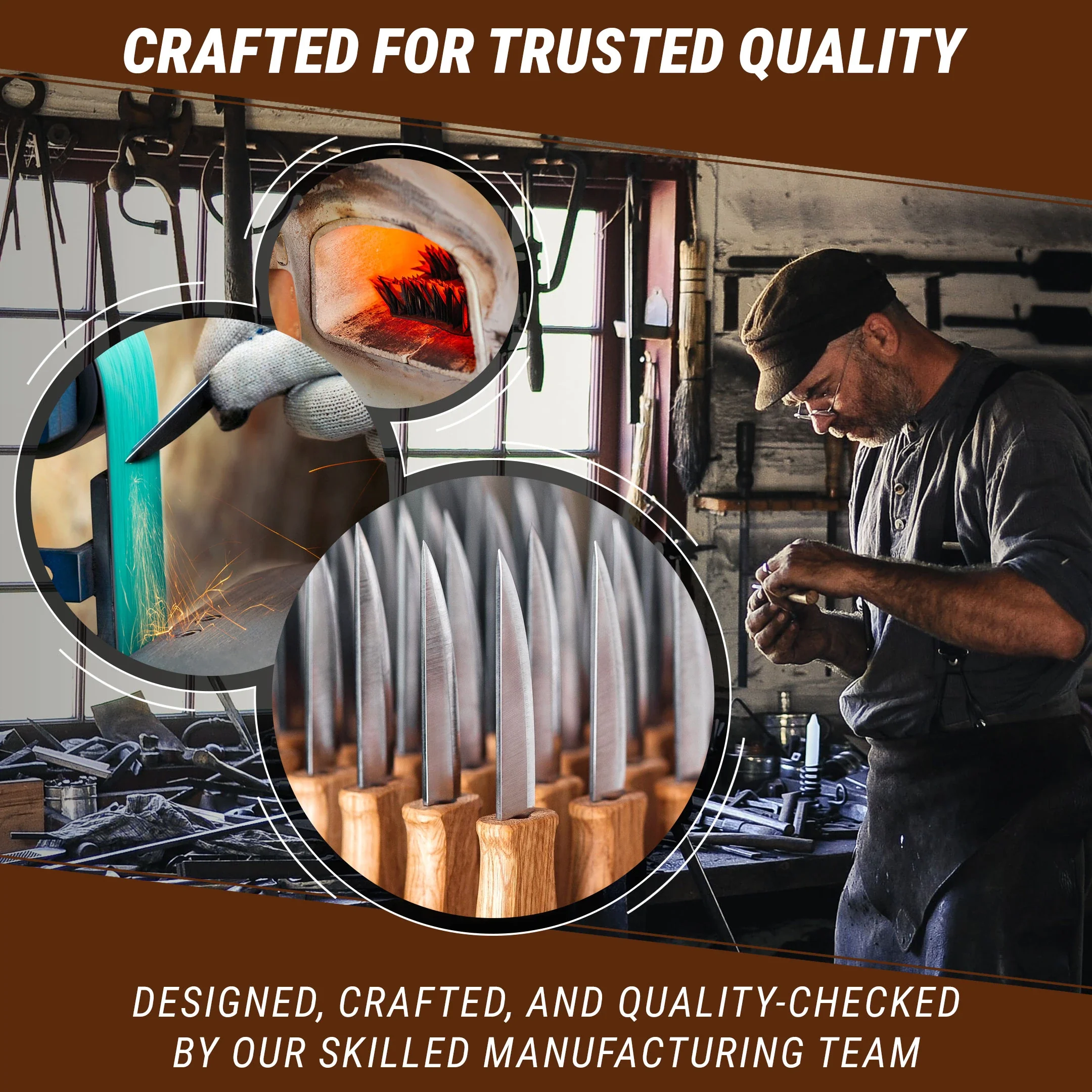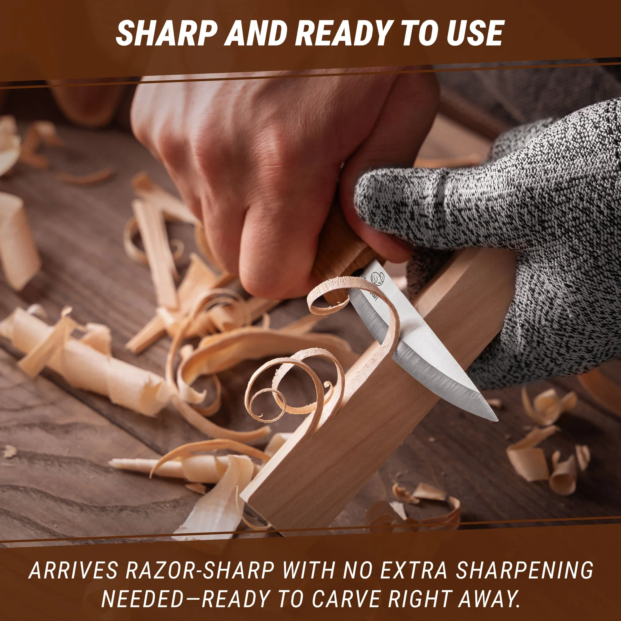 Das Holzschnitzmesser hat einen Griff aus Eiche, der mit natürlichem Leinöl überzogen ist. Die Klinge des Tranchiermessers ist aus speziellem Messerstahl gefertigt, gehärtet und gut geschärft. Es ist sowohl für Rechts- als auch für Linkshänder konzipiert.