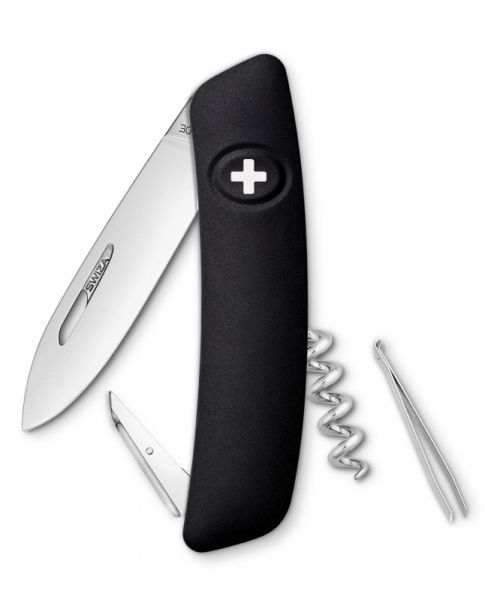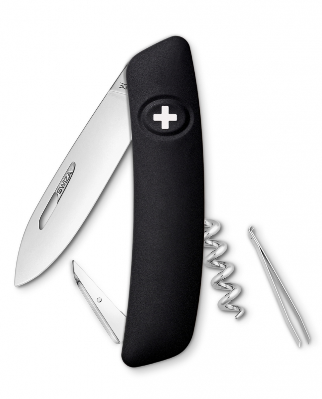 Das Schweizer Taschenmesser SWIZA D01 mit revolutionärem 360° Design und robuster Anti-Rutsch-Oberfläche liegt optimal in der Hand. Mit der leicht gekrümmten Form vom Messer sind die Werkzeuge leicht zugänglich, und dank den durchgehenden Ausstanzungen für Rechts- und Linkshänder einfach zu öffnen: 75mm Klinge mit Sicherheits-Arretierung, Stech- und Bohrahle mit Nadelöhr, Korkenzieher und Pinzette.