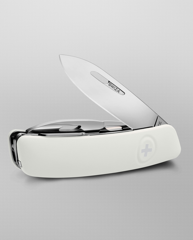 Die 75 mm lange Klinge ist aus Edelstahl 440 / 57 HRC gefertigt, und besteht aus einer Chrom-Molybdän-Legierung. Sie besitzt eine professionelle und dauerhafte Schneidfähigkeit. Neben ihrer Robustheit steht vor allem die Sicherheit im Vordergrund: Zum Entsichern und Schliessen der Klinge ist das SWIZA Kreuz zu drücken. Die durchgehende Ausstanzung ermöglicht ein für Rechts- und Linkshänder optimiertes Öffnen.