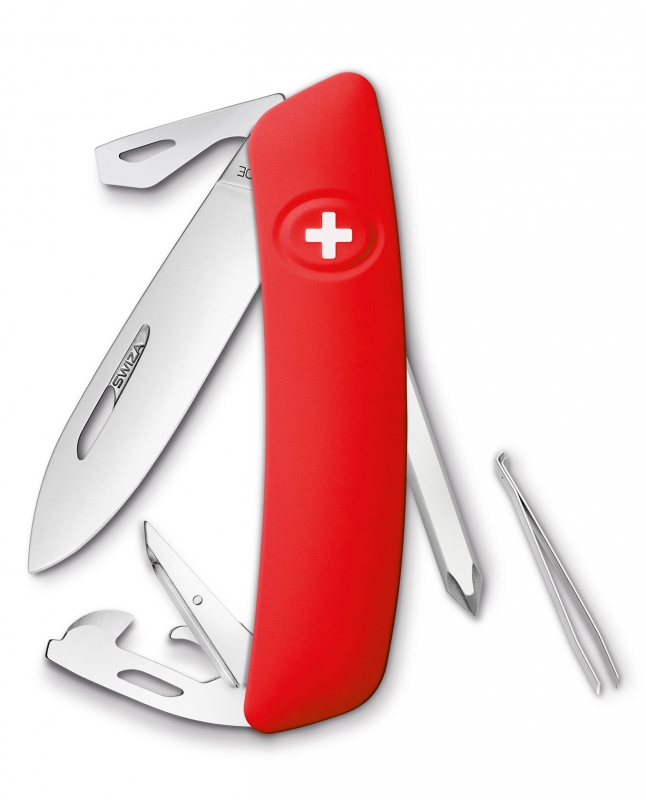 Das Schweizer Taschenmesser SWIZA D04 mit revolutionärem 360° Design und robuster Anti-Rutsch-Oberfläche liegt optimal in der Hand. Mit der leicht gekrümmten Form vom Messer sind die Werkzeuge leicht zugänglich, und dank den durchgehenden Ausstanzungen für Rechts- und Linkshänder einfach zu öffnen: 75mm Klinge mit Sicherheits-Arretierung, Stech- und Bohrahle mit Nadelöhr, Flaschenöffner mit Schraubenzieher Nr. 3 und Drahtbieger, Dosenöffner mit Schraubenzieher Nr. 1, Kreuzschlitz-Schraubenzieher Nr. 1 und Pinzette.