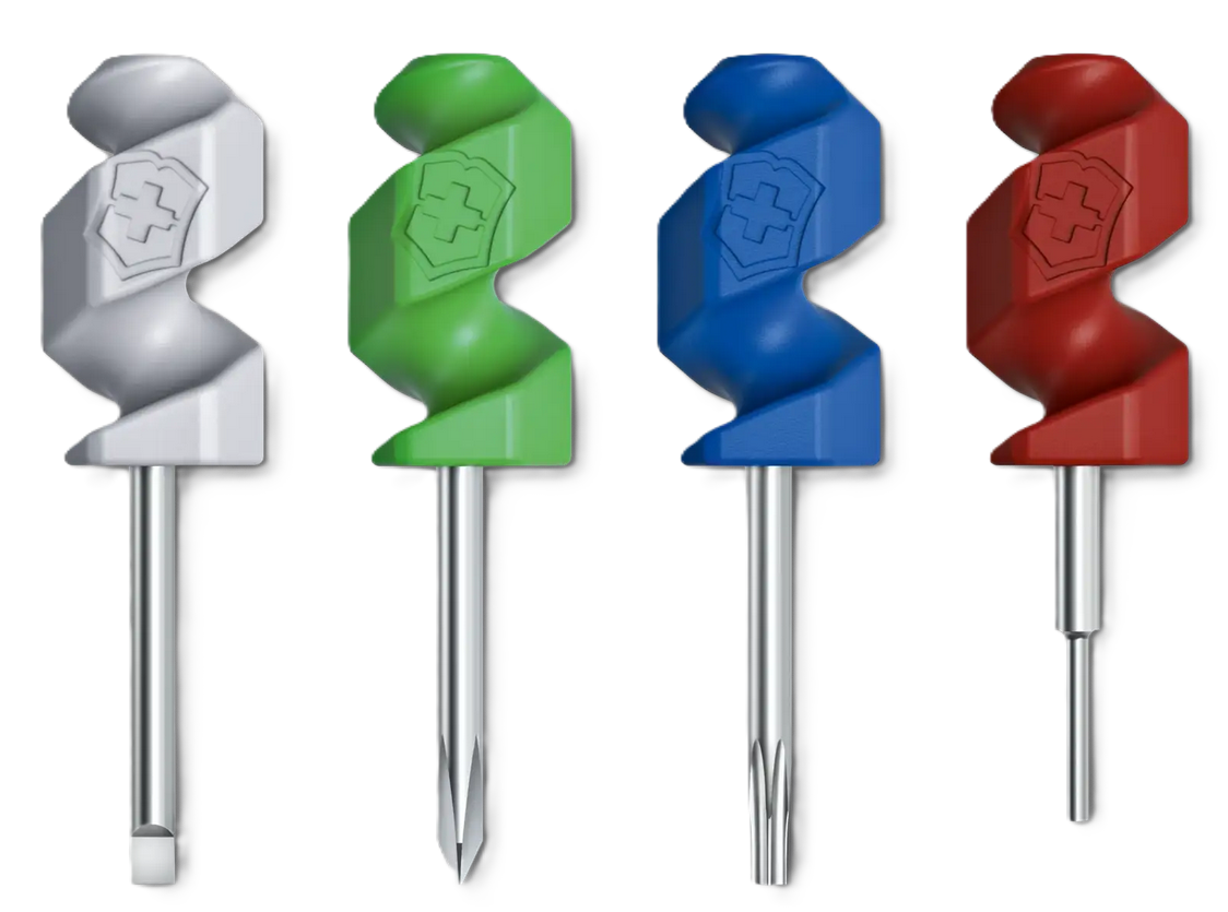 Möchten Sie Ihren Brillenbügel festschrauben? Müssen Sie ein elektronisches Gerät reparieren oder fallen andere kleine Alltagsreparaturen an? Egal was der Tag bringt, mit unserem Set aus vier kompakten Mini Tools sind Sie auf alles vorbereitet. Die cleveren, präzisen Werkzeuge fügen sich in den Korkenzieher des Taschenmessers und sind schnell griffbereit. Zur Auswahl stehen vier smarte Tools: ein Schlitzschraubendreher für Brillen oder Sonnenbrillen, zwei unterschiedliche Schraubendreher in verschiedenen Grössen und ein Stift zum Austauschen Ihrer SIM-Karte. Die perfekte Ergänzung für Ihr Taschenmesser mit einem urbanen Touch.