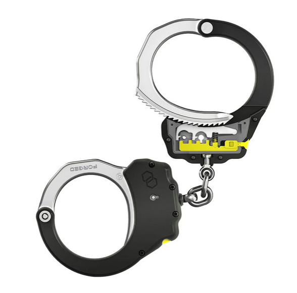 Der Rahmen besteht aus geschmiedetem 7075 T6 Aluminium in Waffenqualität. Dieses Verfahren macht die Handschellen besonders steif, extrem belastbar und gleichzeitig angenehm leicht. Im Gegensatz zu gestanzten Stahlteilen anderer Hersteller vermeidet das Schmiedeverfahren scharfe oder raue Kanten – für mehr Sicherheit und Komfort, sowohl für die Einsatzkraft als auch für die festgesetzte Person.