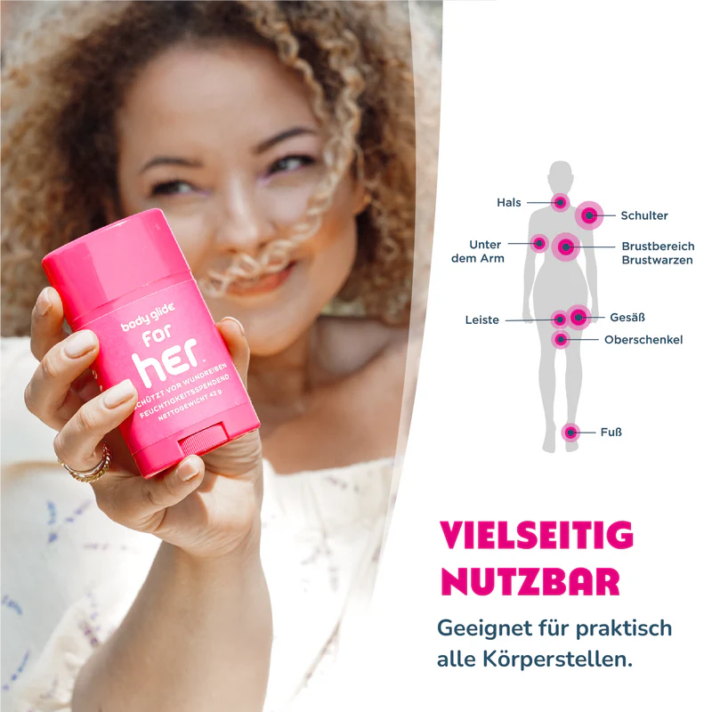 Tipp: BODY GLIDE „for her“ eignet sich auch hervorragend um die Reibung zwischen den Oberschenkeln zu minimieren. Für reibungslose Bewegung auch im Kleid und Rock.