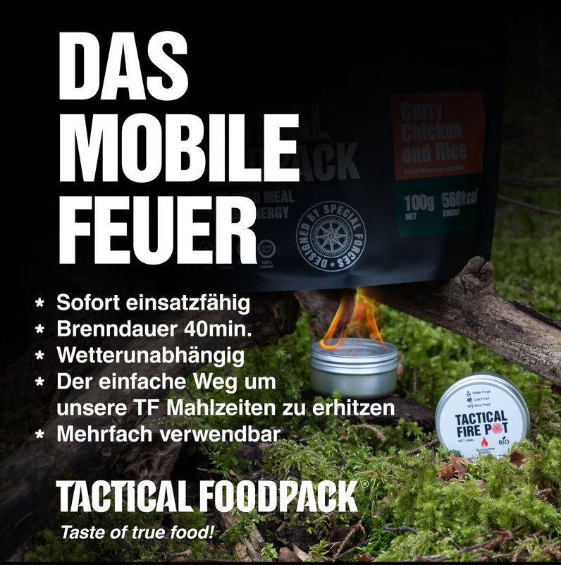 Der Tactical Fire Pot eignet sich perfekt zum Aufwärmen von Tactical Foodpack Speisen. Geben Sie dazu einfach die notwendige Menge kaltes Wasser in die Lebensmittelpackung rühren den Inhalt um. Anschliessend falten Sie den Boden der Tactical Foodpack Speise flach und setzen Sie den Beutel auf das Brenngel, indem Sie zur Platzierung der Packung eine Erhöhung verwenden (2 Tassen, 2 Steine o.a., was höher als das Brenngel ist). Halten Sie die Lebensmittelpackung solange über der Flamme, bis das Wasser darin kocht. Anschliessend heben Sie die Lebensmittelpackung von der Flamme, schließen Sie den Beutel und lassen Sie das Essen für einige Minuten stehen (genaue Zeitangabe auf dem jeweiligen Gericht zu finden). Zum Löschen des Anzündegels setzen Sie einen Deckel auf die Flamme, nicht abblasen! Das Produkt ist wiederverwendbar, Brenndauer insgesamt ca. 40min