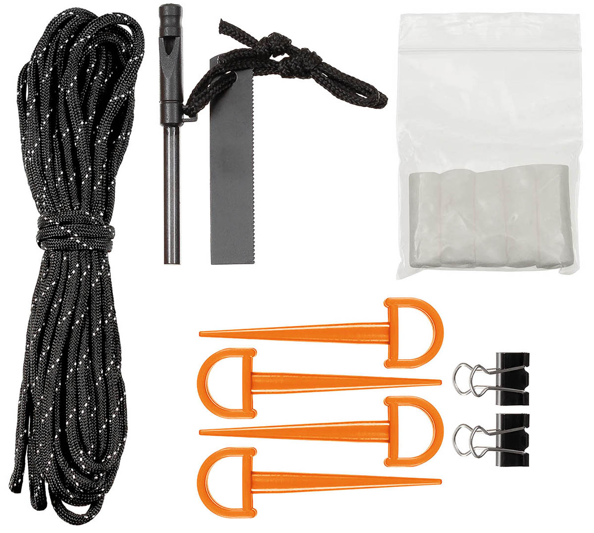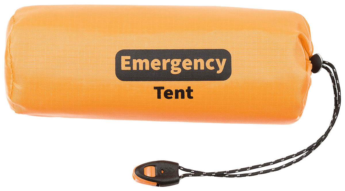 schützt vor Kälte, Nässe, Wind und Hitze 1 Zeltplane mit 4 Metallösen 1 Seil, ca. 6 m 2 Befestigungsclips 4 Zeltheringe 1 Feuerstarter mit Signalpfeife 5 Stück Baumwollzunder Transportbeutel mit Pfeife am Kordelstopper Masse: ca. 244 x 155 cm Packmass: ca. 8 x 23 cm (D x H) Gewicht: ca. 325 g