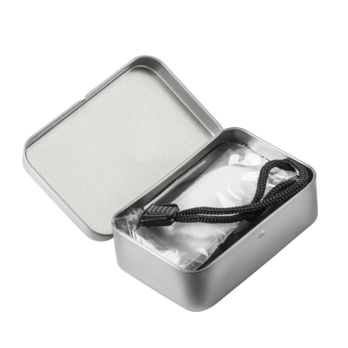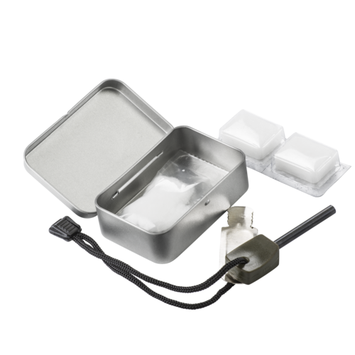 Im Set enthalten: Überlebensbox aus Stahl (Abmessungen: 93 x 62 x 27 mm), ein Feueranzünder mit Schaber, zwei Brennstofftabletten und Watte