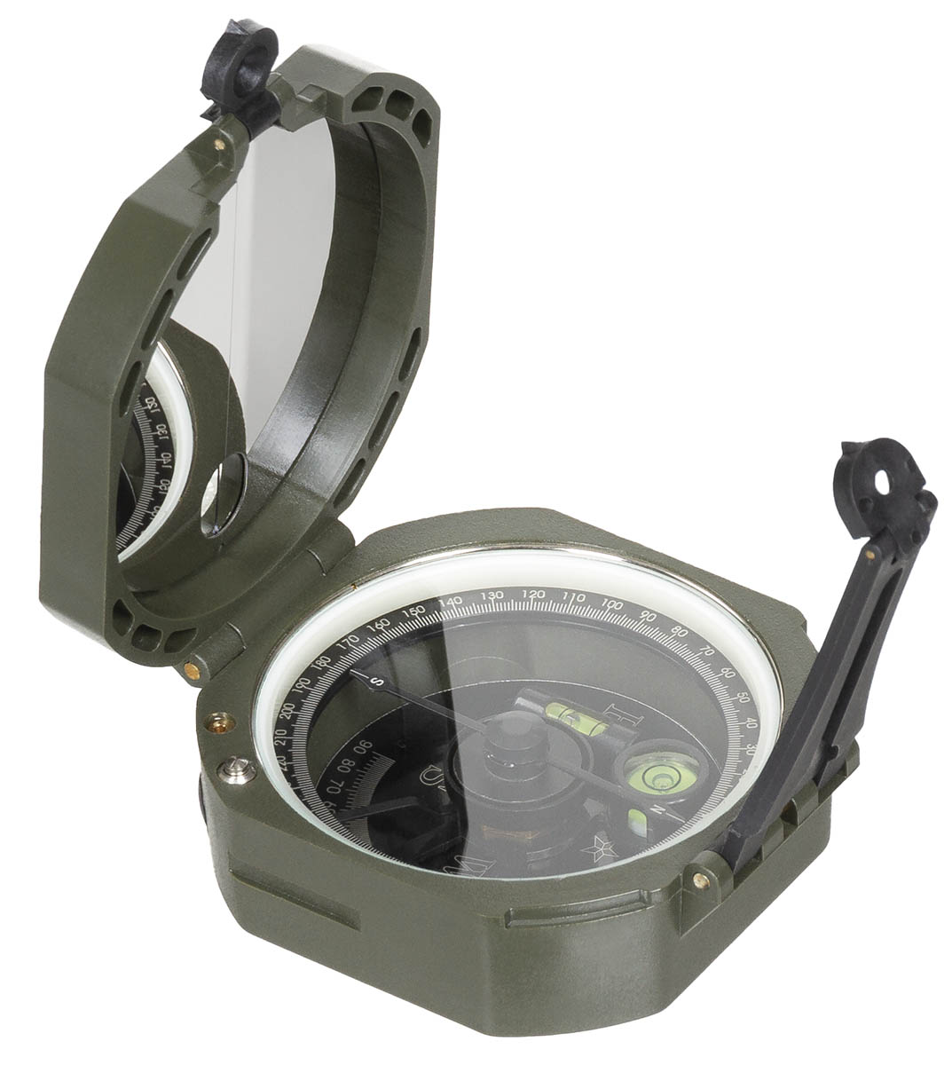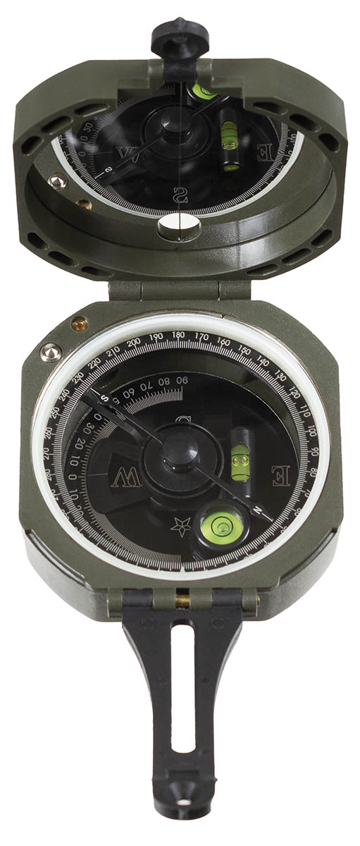 Geologenkompass Ablesung über Spiegel Kompassrose mit 360°-Einteilung fluoreszierende Markierungspunkte Deckel mit Spiegel und kleiner Peilöffnung 2 Wasserwaagen für horizontale und vertikale Ausrichtung Neigungsmesser Peilung über Kimme und Korn Magnetnadel bei geschlossenem Kompass festgestellt Tabelle auf dem Deckel Masse: ca. 7,5 x 7,5 x 3 cm Gewicht: ca. 85 g