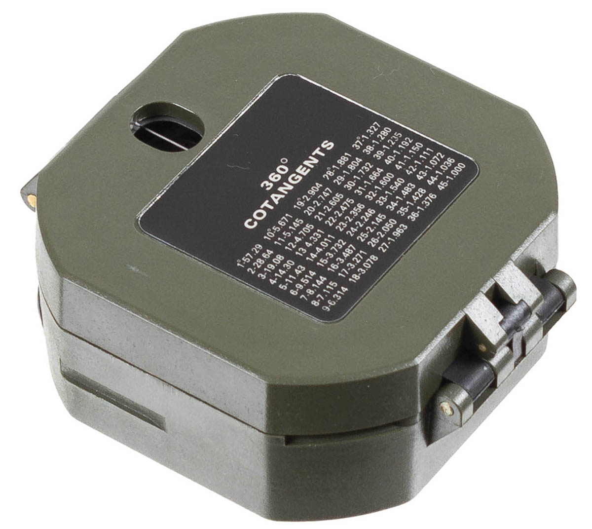 Geologenkompass Ablesung über Spiegel Kompassrose mit 360°-Einteilung fluoreszierende Markierungspunkte Deckel mit Spiegel und kleiner Peilöffnung 2 Wasserwaagen für horizontale und vertikale Ausrichtung Neigungsmesser Peilung über Kimme und Korn Magnetnadel bei geschlossenem Kompass festgestellt Tabelle auf dem Deckel Masse: ca. 7,5 x 7,5 x 3 cm Gewicht: ca. 85 g
