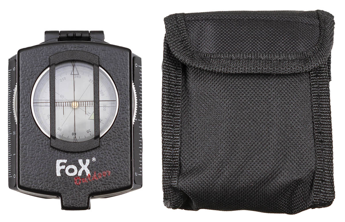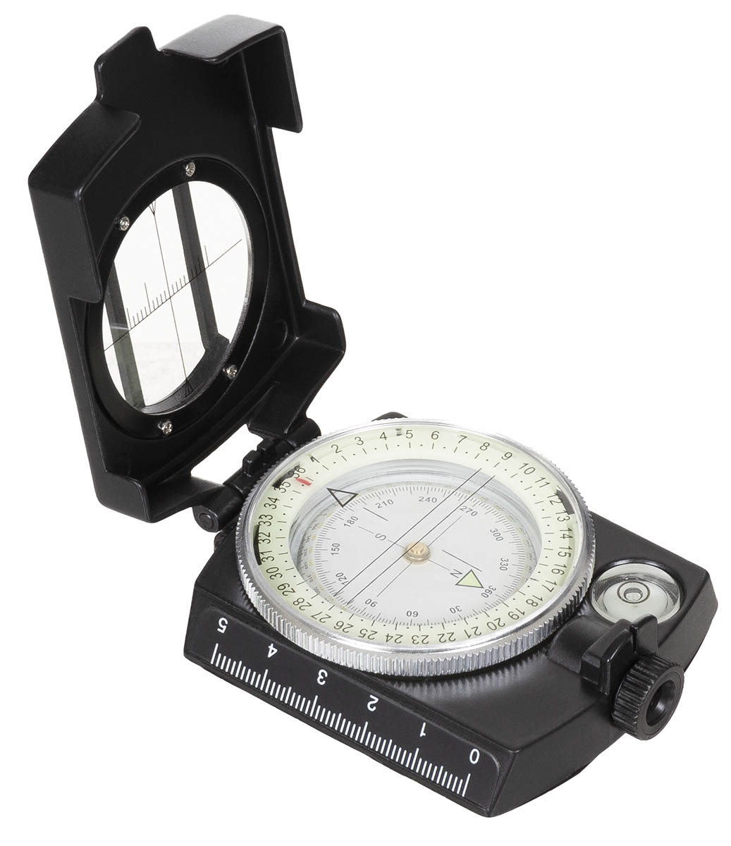 flüssigkeitsgedämpft drehbare Kompassdose Kompassrose mit 360°-Einteilung fluoreszierende Markierungspunkte Sucher mit Lupe und Kimme Deckel mit Sichtfenster und Peillinie cm- und Inch-Skala seitlich Stativgewinde und Tabelle am Boden Libelle / Wasserwaage Bedienungsanleitung mit Gürteltasche Masse: ca. 8,5 x 6 x 3 cm Gewicht: ca. 160 g