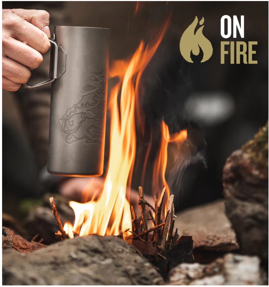Mithilfe der Schmetterlingsgriffe kann der Outer Ti Cup zum Erhitzen von Wasser und zum Garen von Speisen neben heissen Kohlen oder in der Nähe einer direkten Flamme verwendet werden.
