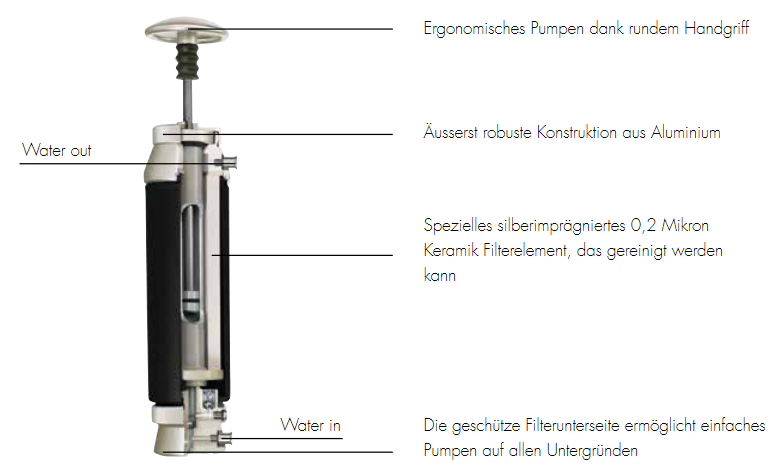 Es handelt sich um einen Keramik-Tiefenfilter, der Bakterien, Protozoen und andere Krankheitserreger zuverlässig entfernt. Die Poren der Filterkeramik (Porengrösse: 0,2 Mikron = 0,0002 mm) sind kleiner als die Mikroorganismen. Diese können wegen ihrer Grösse das Filterelement nicht passieren und werden damit aus dem Wasser entfernt.