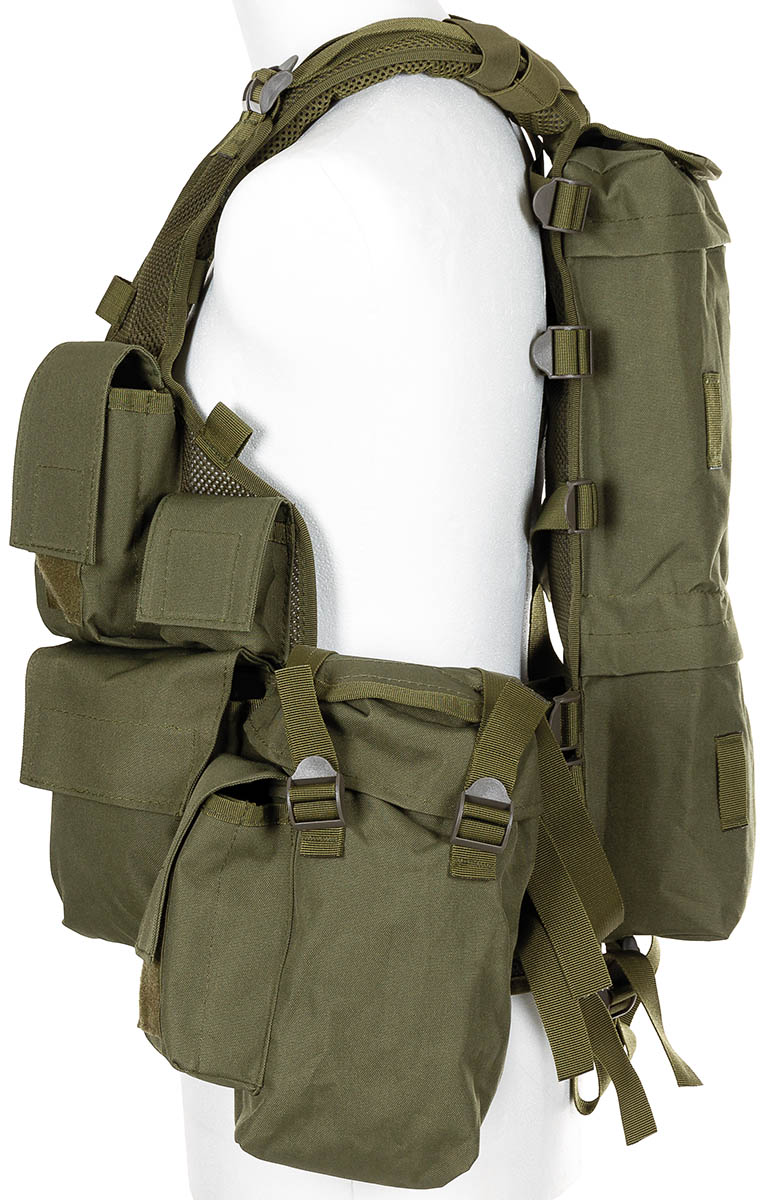Grundmaterial Netzgewebe Rücken, Schulter und Hüfte gepolstert grössenverstellbar durch diverse Zugbänder 2 Klickverschlüsse vorne unterteilte Rückentasche mit je 1 Reissverschluss im oberen und mittleren Bereich und Deckel mit Klett ca. 7 x 4 cm 4 Befestigungsschlaufen hinten jeweils 3 verstellbare Befestigungsriemen seitlich je 1 Hüfttasche mit Riemenverschluss und 1 aufges. Tasche mit 2 Einschubfächern mit Klettv. rechte Seite (von oben): 1 Tasche mit 2 Einschubfächern mit Klettverschluss und seitlicher Stifthalterung daneben 1 kleine Tasche mit Klettverschluss 1 Doppelmagazintasche mit Klettverschluss linke Seite (von oben): 1 Tasche mit 2 Einschubfächern mit Klettverschluss und seitlicher Stifthalterung daneben 1 kleine Tasche mit Klettverschluss 1 grosse Tasche mit Klettverschluss