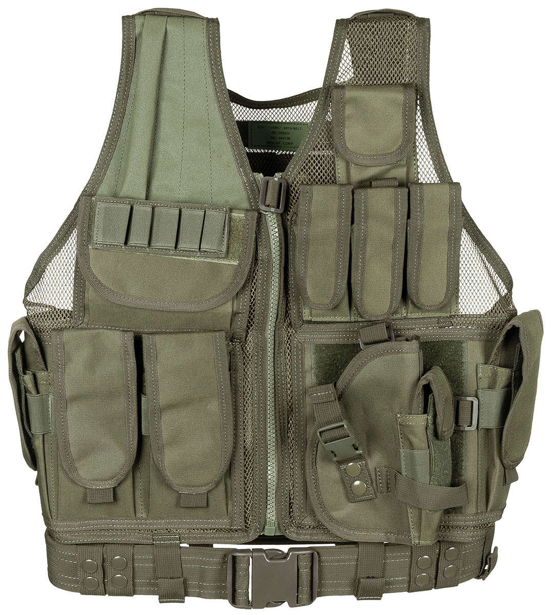 Grundmaterial Netzgewebe grössenverstellbar durch seitliche Zugbänder 2 Innentaschen mit Reissverschluss 6 Magazintaschen davon 2 abnehmbar per Klett 5 Aussentaschen mit Klett, 3 davon abnehmbar Patronenhalter für 5 Patronen abnehmbar per Klett 2 Molletaschen mit Clip abnehmbar 1 abnehmbares Pistolenholster mit Magazintasche Molle-Aufnahmeschlaufen hinten, 1 Tragegriff 1 Koppel mit Plastikverschluss