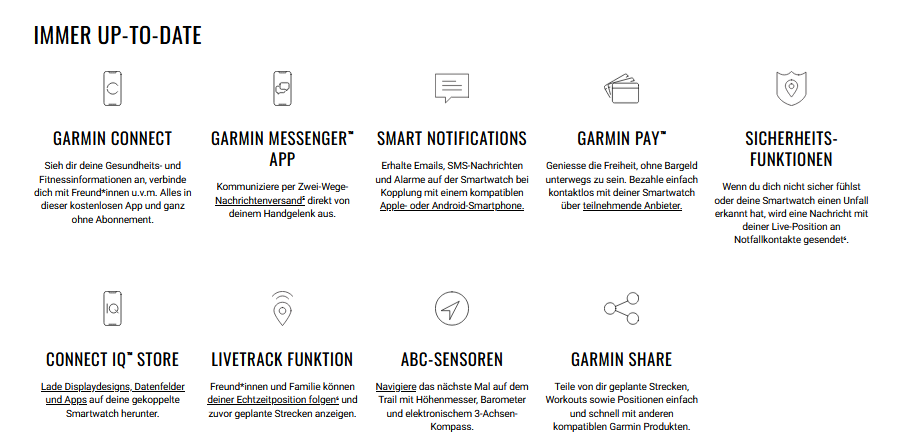 Connect IQ™ (herunterladbare Displaydesigns, Datenfelder, Widgets und Apps) | ✓ |