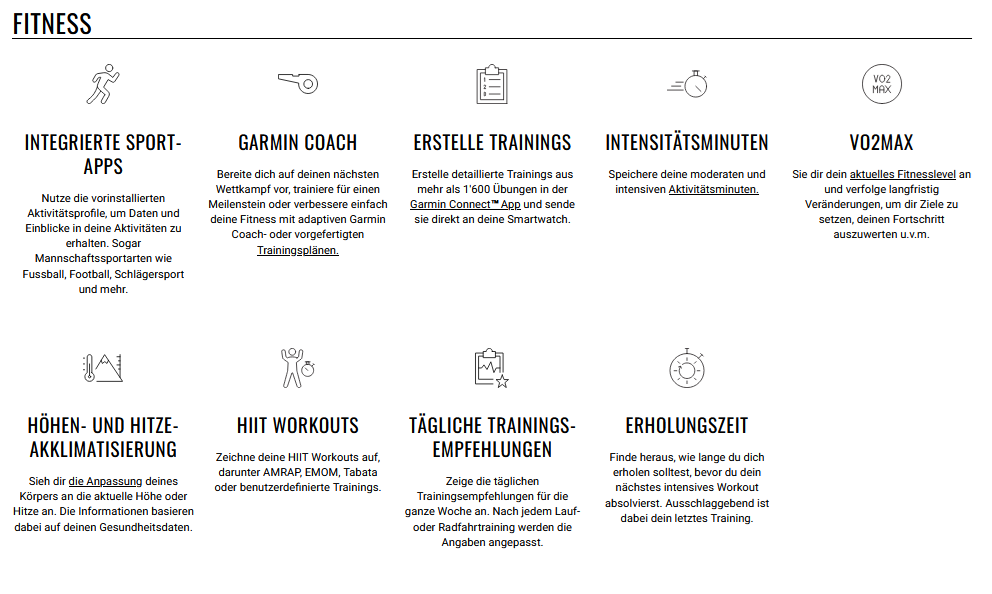 Mit über 1.600 Übungen, Garmin Coach Trainingsplänen und täglicher Trainingsempfehlung bringst du dein Workout auf das nächste Level. Beobachte deine Gesundheit mit erweiterten Funktionen wie HFV-Status, Pulse Ox, Stressmessung und sogar Nickerchenerkennung.