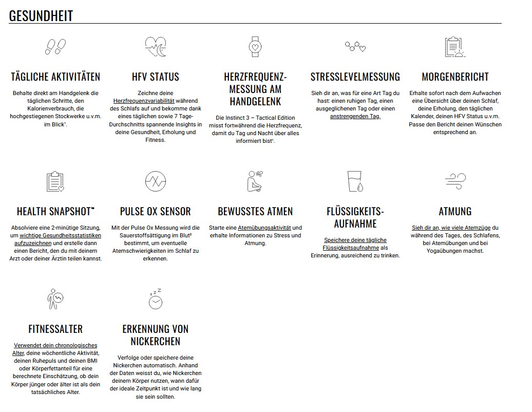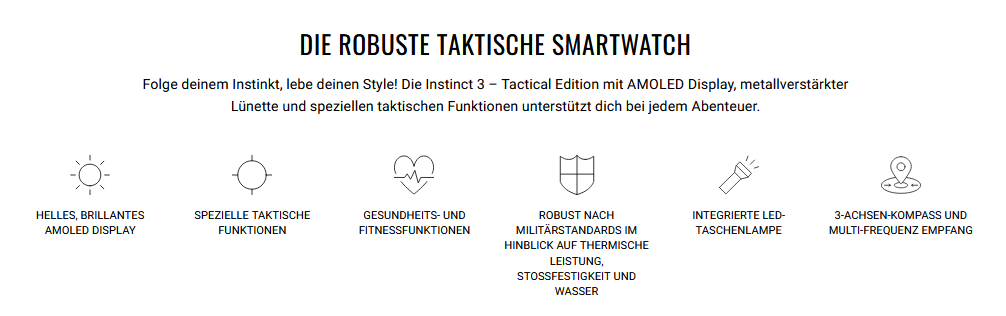 Folge deinem Instinkt. Lebe deinen Style. Die Instinct 3 – Tactical Edition vereint kompromisslose Robustheit mit modernster Technologie und einem hochauflösenden AMOLED Display. Ob Outdoor-Abenteuer, taktische Einsätze oder sportliche Herausforderungen – diese Smartwatch ist dein verlässlicher Partner in jeder Lage.