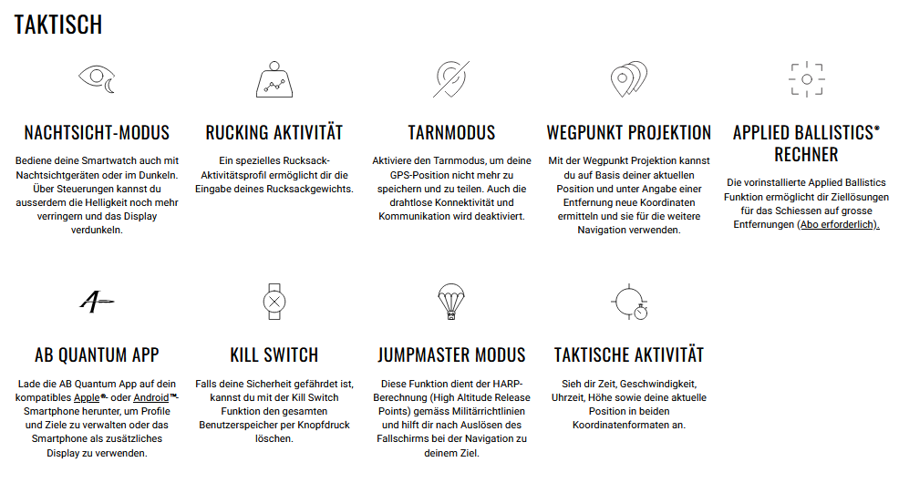 Diese Smartwatch ist mehr als nur ein Wearable. Mit Funktionen wie Tarnmodus, Dual-Position-GPS, Rucking-Aktivität und Kill Switch erfüllt sie höchste militärische Anforderungen. Navigiere präzise mit 3-Achsen-Kompass, Höhenmesser und der neuen SatIQ™-Technologie – egal wie anspruchsvoll dein Terrain ist.