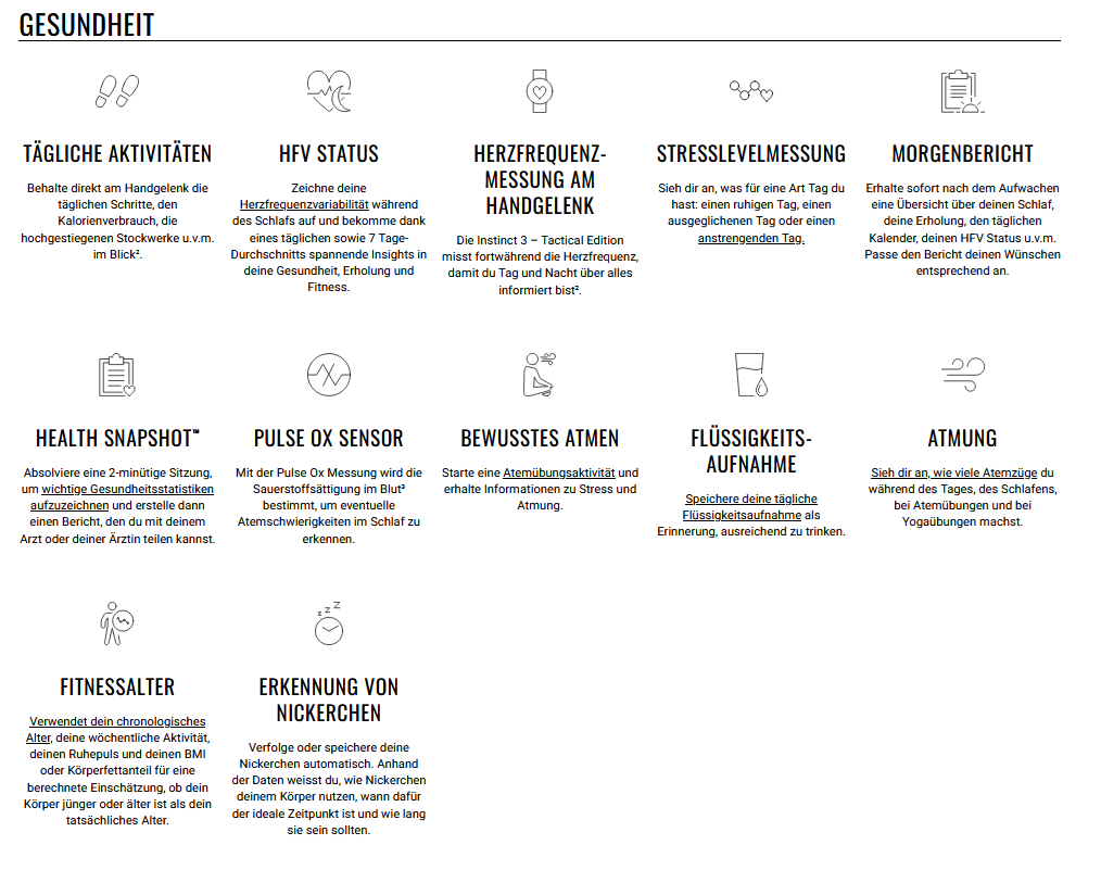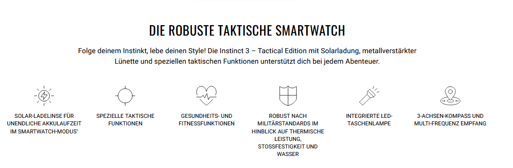 Die Instinct 3 – Tactical Edition ist der perfekte Begleiter für Abenteurer, Einsatzkräfte und Outdoor-Enthusiasten, die maximale Ausdauer, taktische Präzision und smarte Technik in einem Gerät vereint haben wollen. Mit Solarenergie, militärischer Robustheit und spezialisierten Funktionen bist du für jede Mission bereit – ganz gleich, wohin sie dich führt.