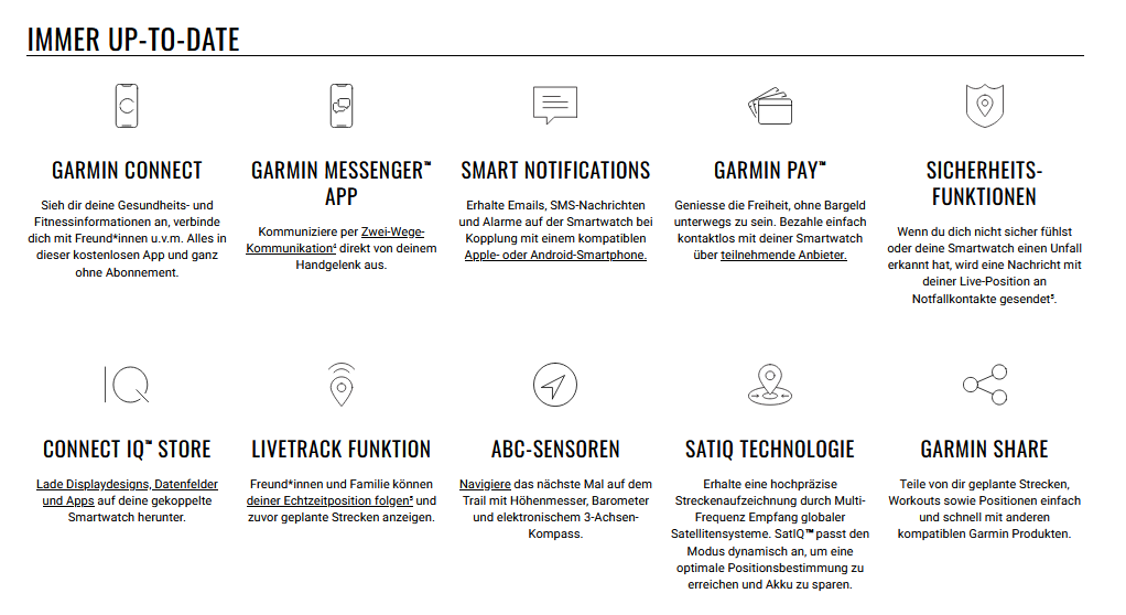 Connect IQ™ (herunterladbare Displaydesigns, Datenfelder, Widgets und Apps) | ✓ |