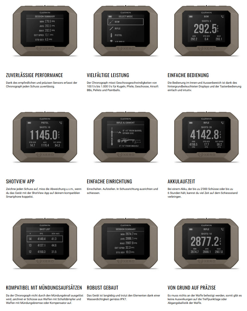 Da der Chronograph nicht durch den Mündungsknall ausgelöst wird, zeichnet er Schüsse aus Waffen mit Schalldämpfer und Waffen mit Mündungsbremse oder Kompensator auf.