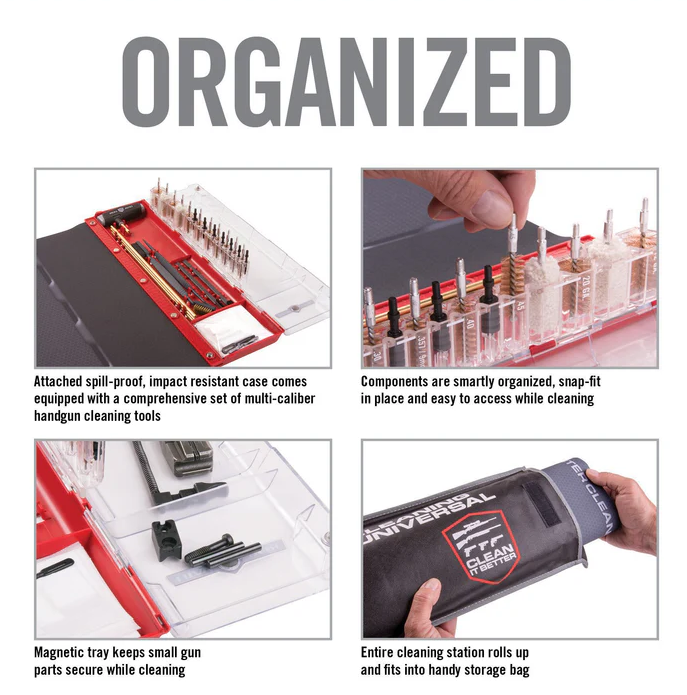 - Master Cleaning Station® – kompatibel mit Handfeuerwaffen im Kaliber .22, 9 mm, .357, .38, .40, .45, 20 und 12 GA