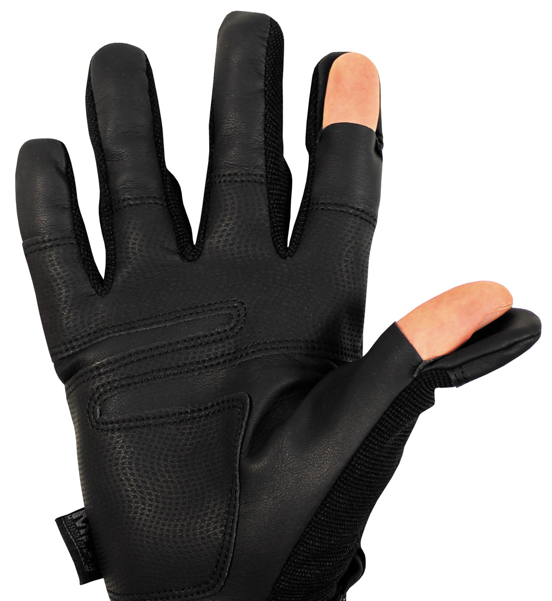 Daumen und Zeigefinger umklappbar atmungsaktiv und schnelltrocknend sehr gute Griff- und Tasteigenschaften Kunststoffprotektoren am Handrücken im Carbon-Look Ventilationslöcher an den Fingerknöcheln Kunstlederbesatz auf der Handinnenfläche und teilweise am Handrücken Klettverschluss am Handgelenk zur Weitenverstellung