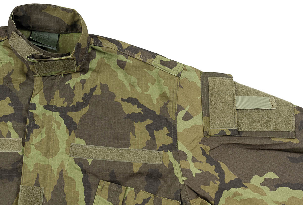 US ACU ARMY COMBAT UNIFORM Jacke Basismodell der US Army für alle Einsatzgebiete verdeckter 2-Wege RV mit Klettverschluss 2 schräg aufgesetzte Brusttaschen mit seitlicher Patte und Klettverschluss 2 aufgesetzte Ärmeltaschen mit Patte und Klettverschluss, besetzt mit Klettflauschpatch 2 Ellbogentaschen mit Klettverschluss für Ellbogenprotektoren Stehkragen mit Klett zur Weitenregulierung 2 Rückenfalten für mehr Bewegungsfreiheit 3 Klettflauschpatches auf Brusthöhe Klett am Ärmelsaum zur Weitenregulierung