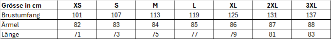 Grösse in cm | XS | S | M | L | XL | 2XL | 3XL |