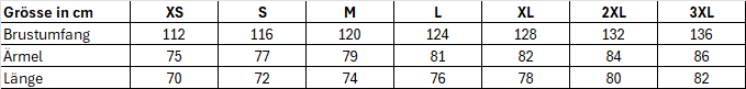 Grösse in cm | XS | S | M | L | XL | 2XL | 3XL |