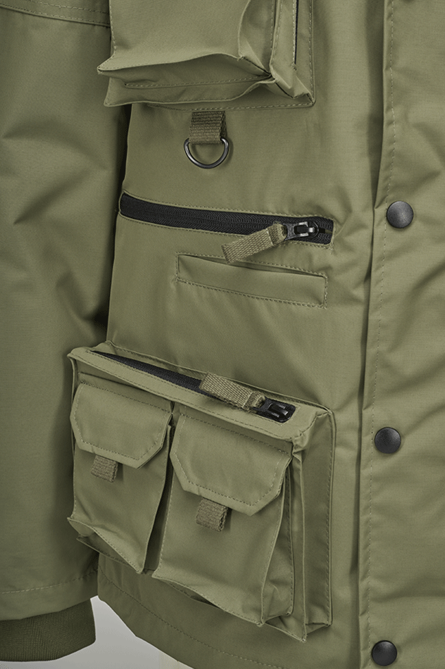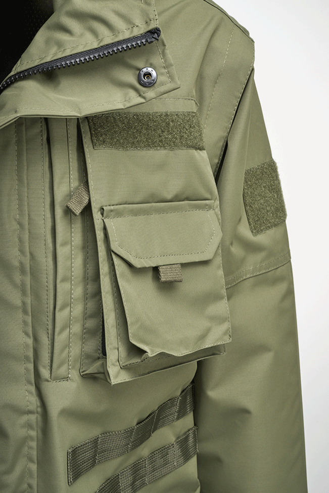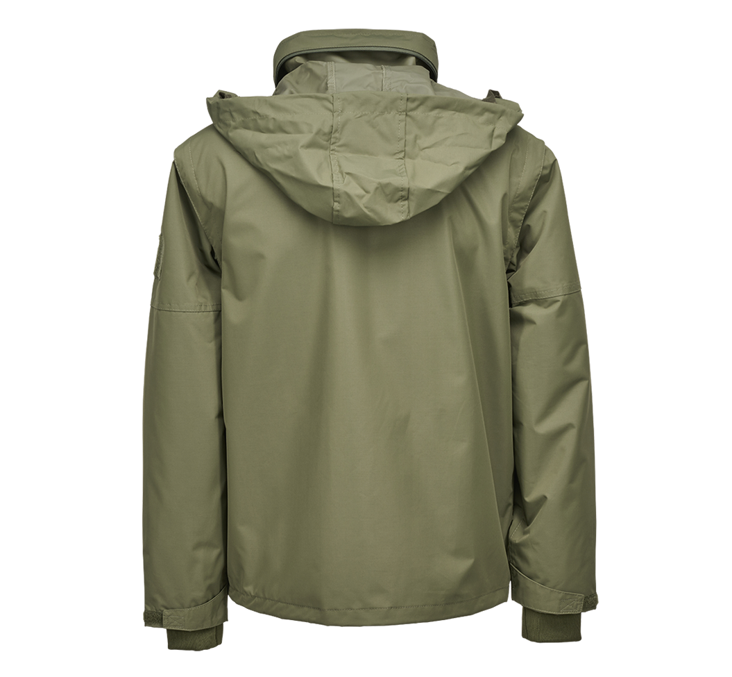 mittels Reißverschlusses abnehmbare Ärmel / 3000 mm Wassersäule (Klasse 3) / atmungsaktives Mesh-Innenfutter / Kapuze mit Kordelzug im Kragen verstaubar / Patchfläche auf Brusttasche und Oberarm / 2 große aufgesetzte Brusttaschen mit Zusatztaschen und seitlichem Reverse-Reißverschluss / 2 große aufgesetzte Hüfttaschen mit Zusatztaschen und Reverse-Reißverschluss / 1 Einschubtasche mit Reverse-Reißverschluss / Windschutzleiste mit Druckknöpfen / 2 Einschubtaschen / Innentasche mit Klettverschluss / D-Ring auf der Front / Molle System Bänder / Ärmelabschlüsse mit Klettverschluss / Ärmel mit weichen, hochwertigen Bündchen