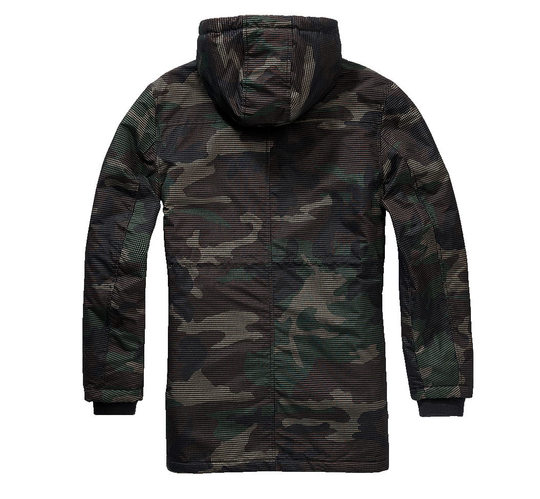 innovative, strukturierter Oberfläche / hohe Isolationsleistung / Kapuze mit Kordelzug / langer Schnitt / zwei seitliche Einschubtaschen / Innentasche / stabiler Reißverschluss / Windschutzleiste mit Druckknopfverschluss / Ärmel mit weichen, hochwertigen Bündchen / weitenregulierbare Taille / Woodland-Muster / Logo Knöpfe