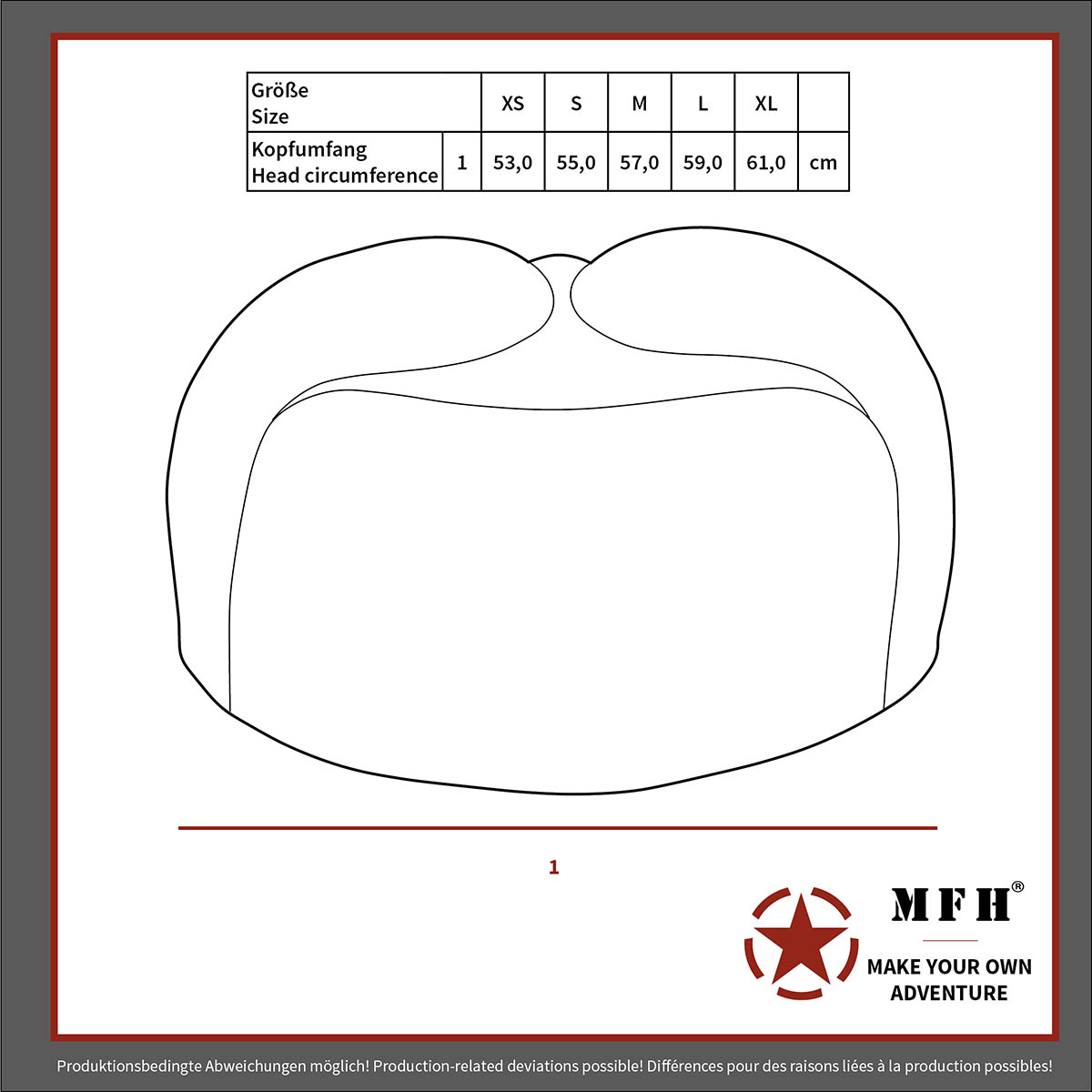 mit grossen und kleinen Ohrenklappen kl. Klappen m. Knöpfen oben u. unten zu befestigen Kinnband mit Clipverschluss Stirnklappe mit Druckknöpfen Ohren, Stirn und Innenseite mit Kunstfell besetzt innen Steppfutter rechts kleines "Fox" Label