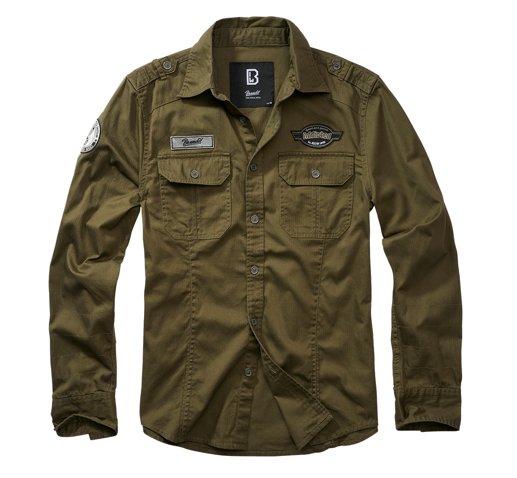 gerader, klassischer Schnitt / Schulterklappen / 2 Brusttaschen mit Knöpfen / Knopfleiste / Brandit-Label aus Metall / drei gestickte Aufnäher