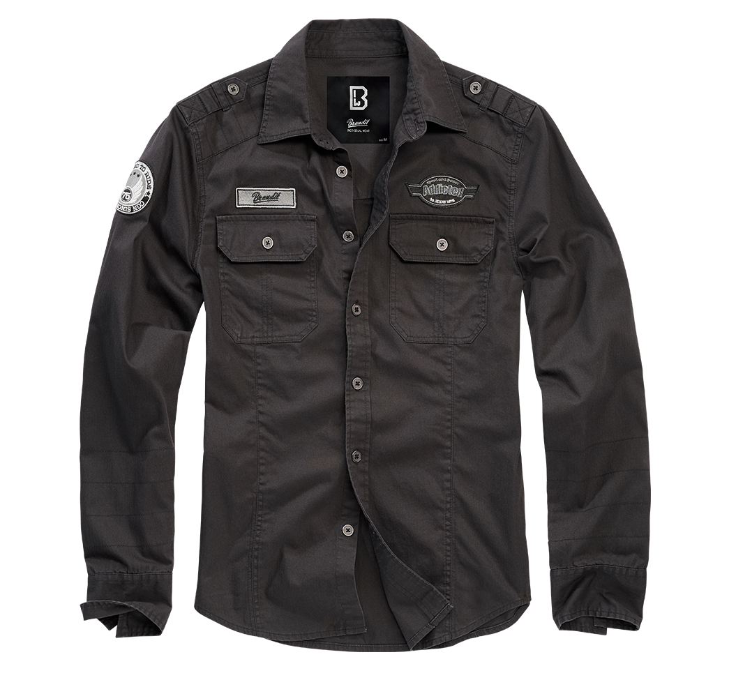gerader, klassischer Schnitt / Schulterklappen / 2 Brusttaschen mit Knöpfen / Knopfleiste / Brandit-Label aus Metall / drei gestickte Aufnäher