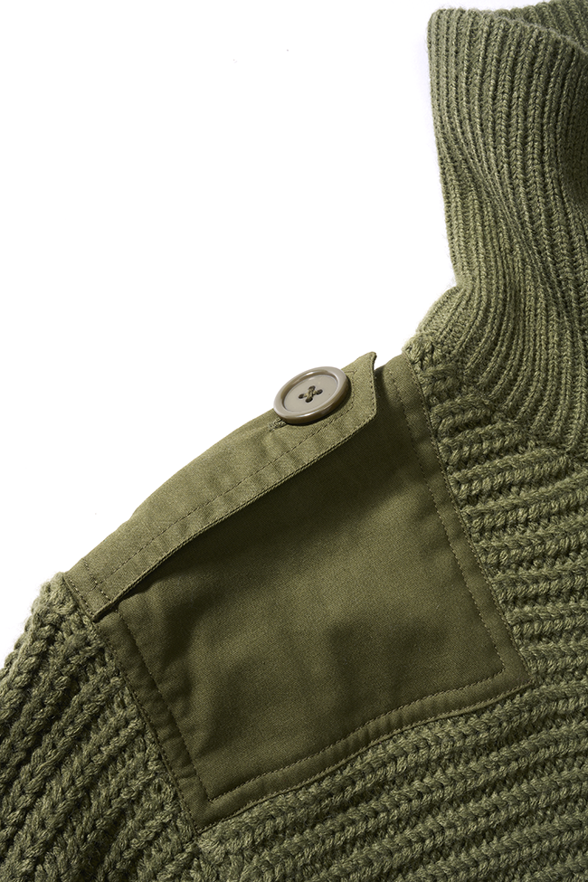 zeitloser Grobstrickpullover / Design nach Vorbild des österreichischen Alpin Armee Pullovers / weiches, angenehmes Tragegefühl ohne Kratzen / breite Strickbündchen an Ärmeln und Saum / hoher Kragen mit Knopfleiste / Schulterklappen mit Knopfverschluss / verstärkte, robuste Ellenbogen- und Schulterpartie