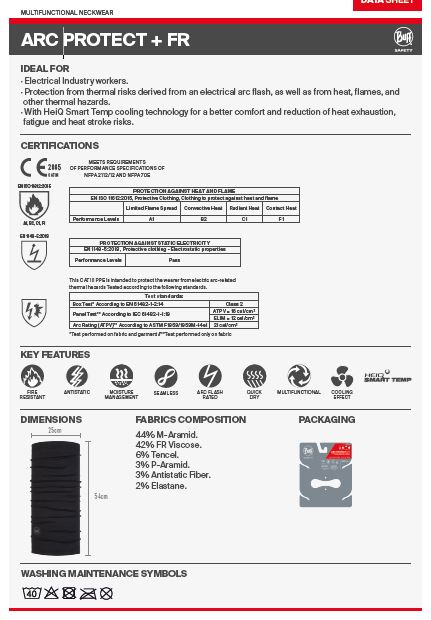 - Feuerschutz: BUFF® Professional Produkte haben die EG-Baumusterprüfbescheinigung nach EN ISO 11612:15 erhalten.