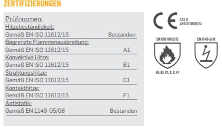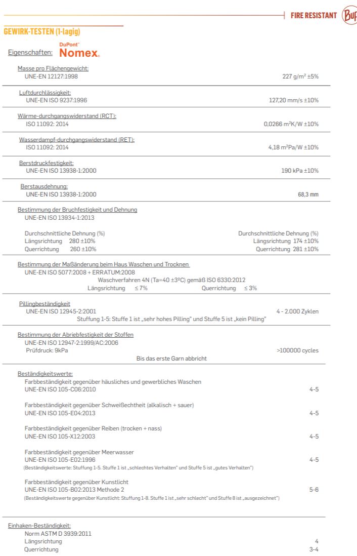 - Feuerschutz: BUFF® Professional Produkte haben die EG-Baumusterprüfbescheinigung nach EN ISO 11612:15 erhalten.