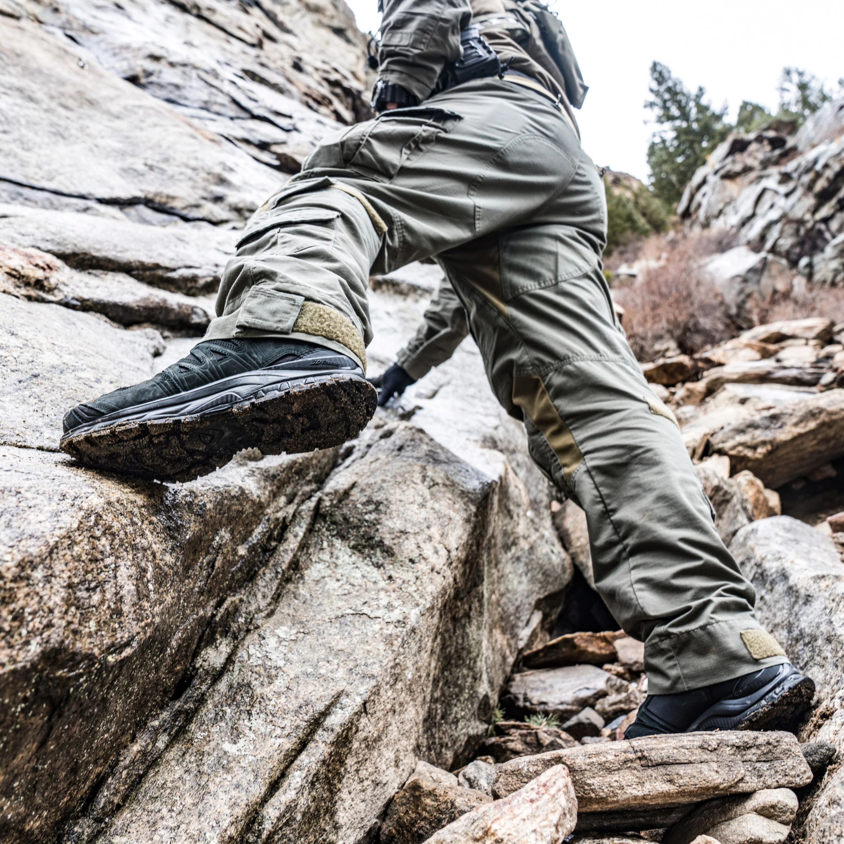 Lange Einsätze haben das Ermüden und damit Absinken des Fusses zur Folge. Um zu verhindern, dass dem Bewegungsapparat des Fusses langfristig geschadet wird, sorgt eine anatomisch geformte OrthoLite Innensohle für natürliche Belastung und damit beste Entlastung. Die Mittelsohle ist eine Dual Density Mittelsohle aus Energiezellenschaum, die für optimale Federung und Stossdämpfung sorgt. Die Aussensohle besteht aus einem höchst belastungsfähigen 3D Chassis, das dank seiner Anti Puncture Enigma Zero HT2 Struktur auch in geröll- oder scherbenlastigen Umgebungen problemlos funktioniert. Die Contragrip Sohle sorgt ausserdem dafür, dass der Einsatzstiefel rutschfest ist und nicht den Halt verliert, selbst wenn der Untergrund nass ist. Wie bei allen taktischen Stiefeln ist der vordere Zehenbereich verstärkt und gegen Stösse geschützt.