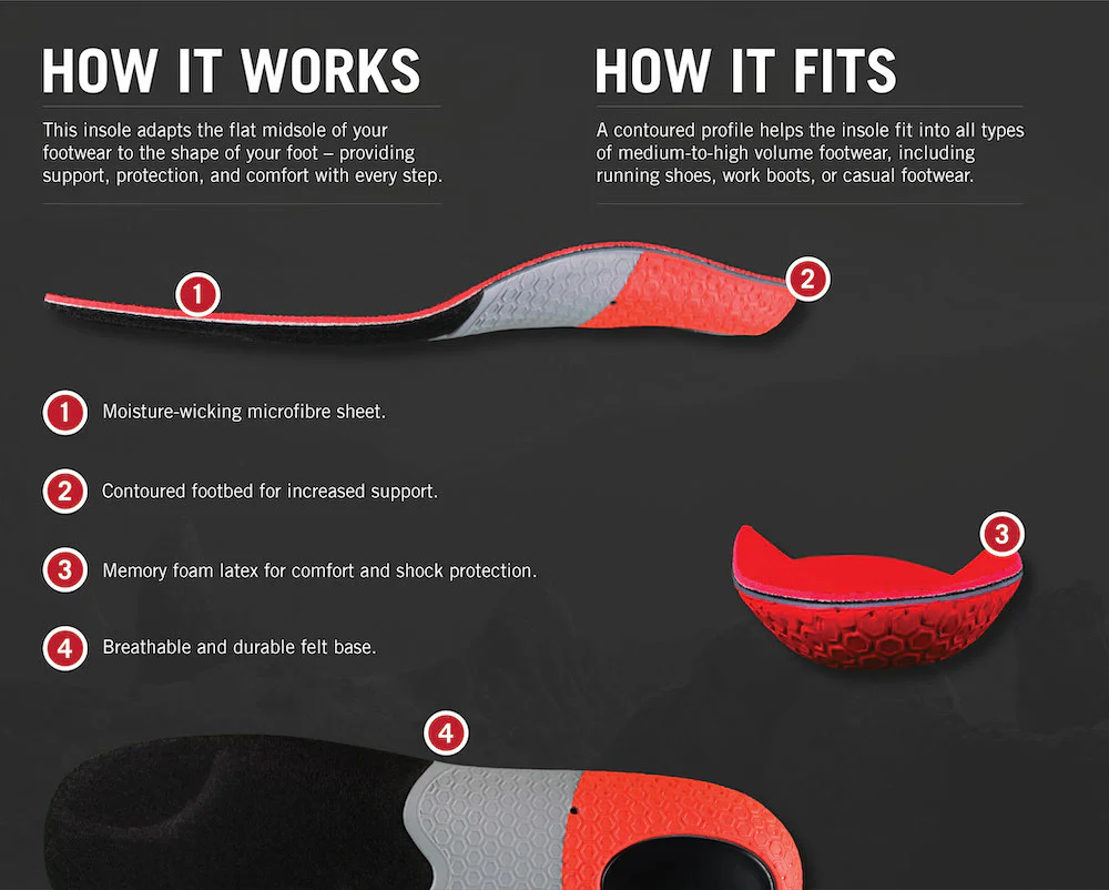 Diese Einlegesohle basiert auf einer Filz-Basis, die für hohe Atmungsaktivität und ein effektives Feuchtigkeitsmanagement sorgt. Der Kern besteht aus Memory-Schaum, der zusätzlichen Komfort bietet. In Kombination mit einer konturierten EVA-Schale und Gel-Ferseneinsätzen sorgt sie für Fußgewölbeunterstützung, festen Halt der Ferse und Stoßschutz. Dieses wunderbare Paket aus Komfort und Unterstützung wird durch eine Coolmax® DermoDry-Oberfläche abgerundet, die Feuchtigkeit ableitet und reguliert.