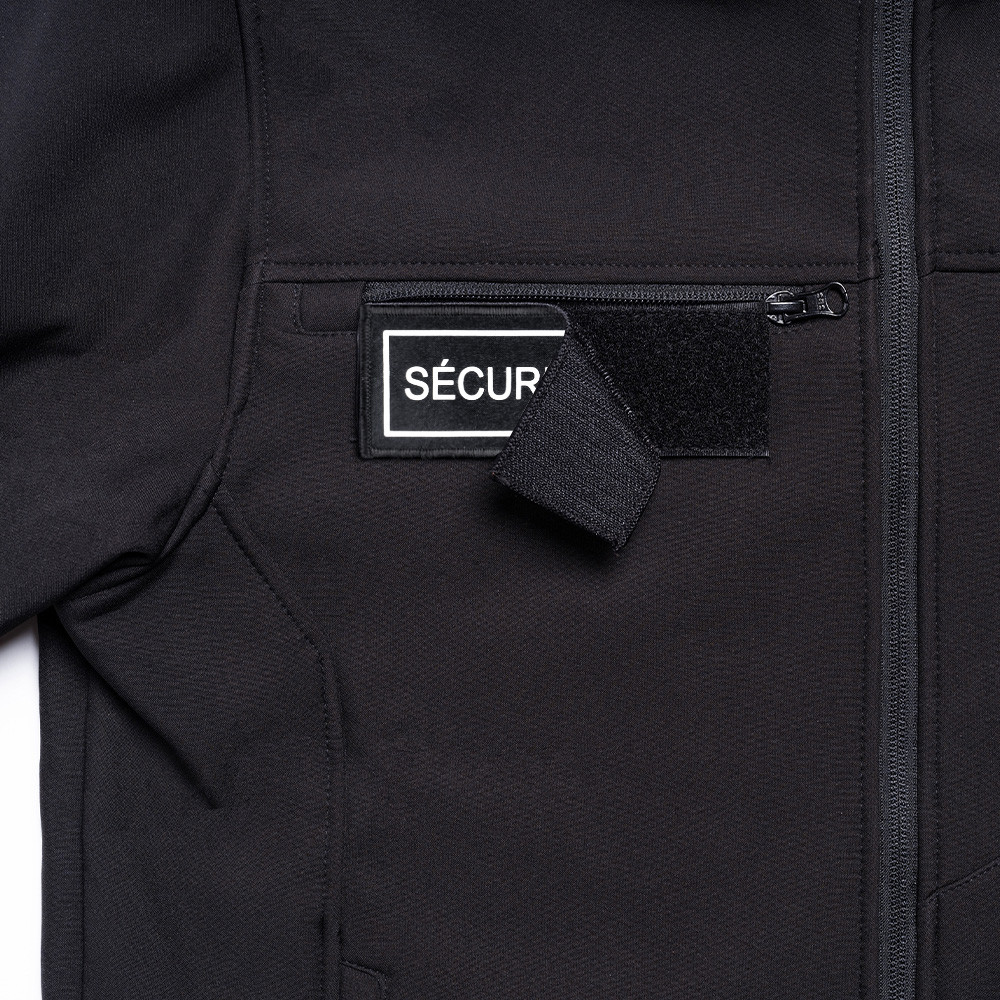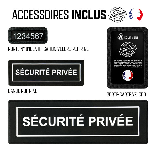- 2 abnehmbare „SÉCURITÉ PRIVÉE“ Patches (Rücken: ca. 30 x 9 cm / Brust: ca. 13 x 5 cm)