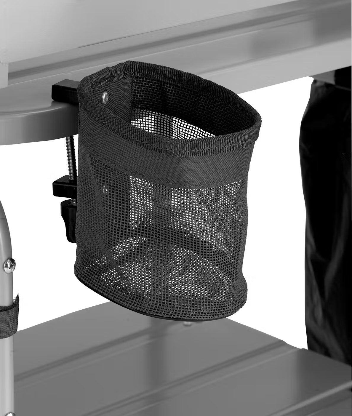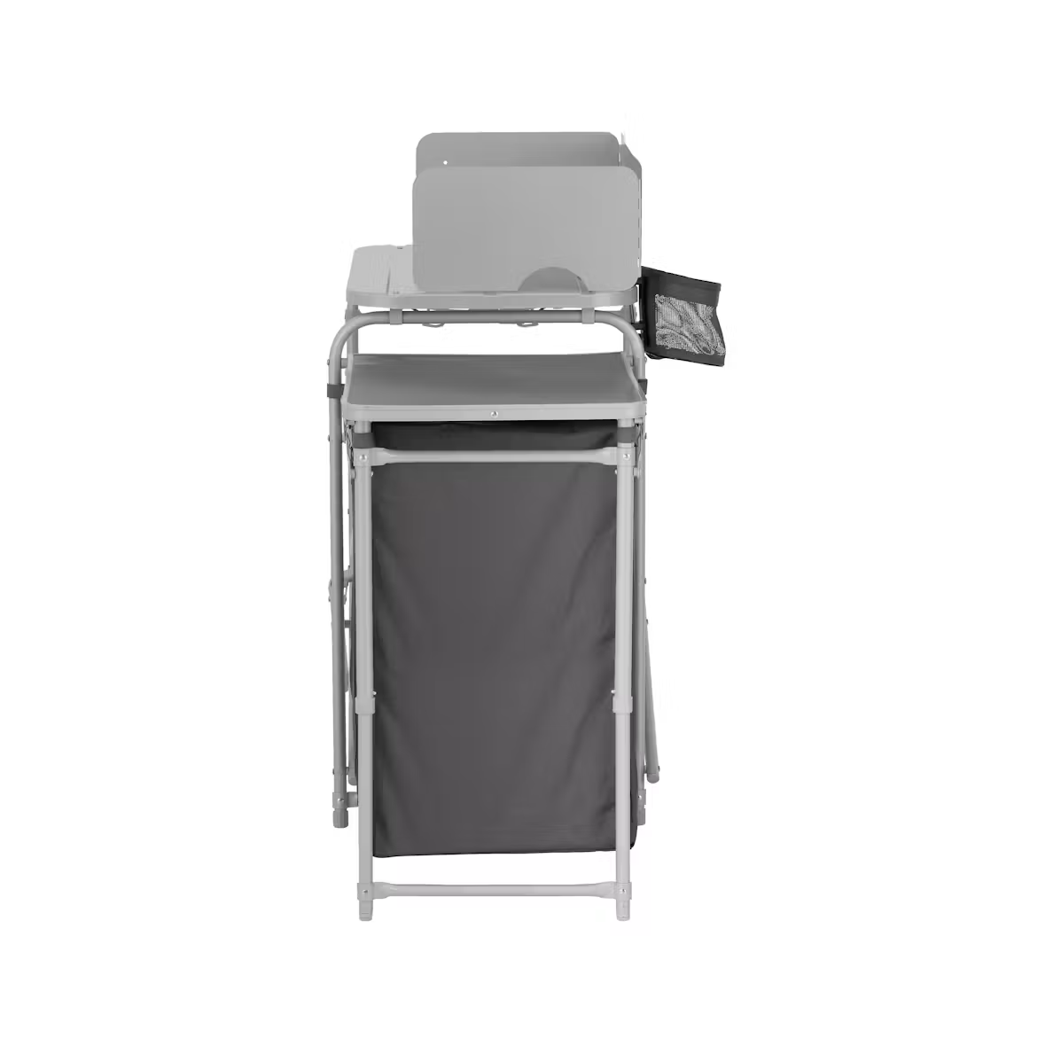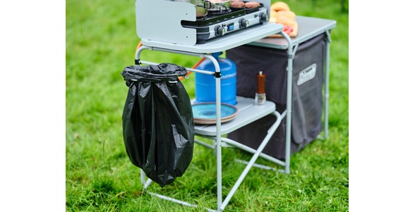 Der Müllbeutelhalter des Cooking Stand ermöglicht es stets Sauberkeit auf der Arbeitsfläche zu bewahren. Darüber hinaus können in dem hängenden Textilschrank mit Regaleinsatz Kochutensilien oder Lebensmittelvorräte verstaut werden, um stets die gewünschte Ordnung auf dem Campingplatz zu behalten.