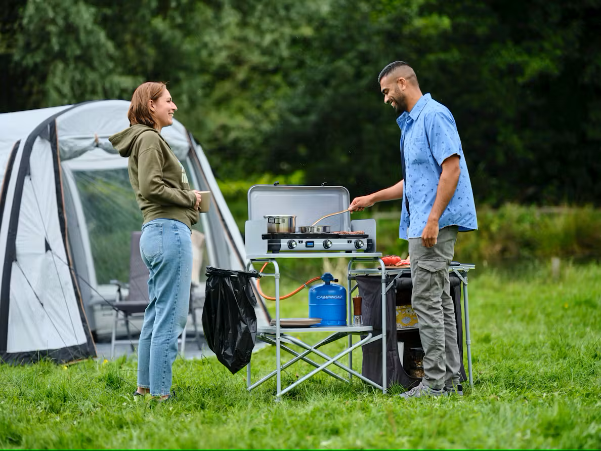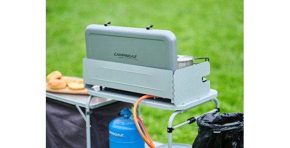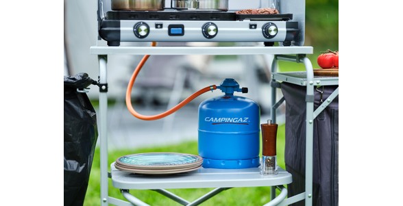 - Der Ständer wurde speziell für Campingaz®-Kocher entwickelt und verfügt über eine integrierte Ablage und einen Halter für Gasflaschen und Kartuschen.