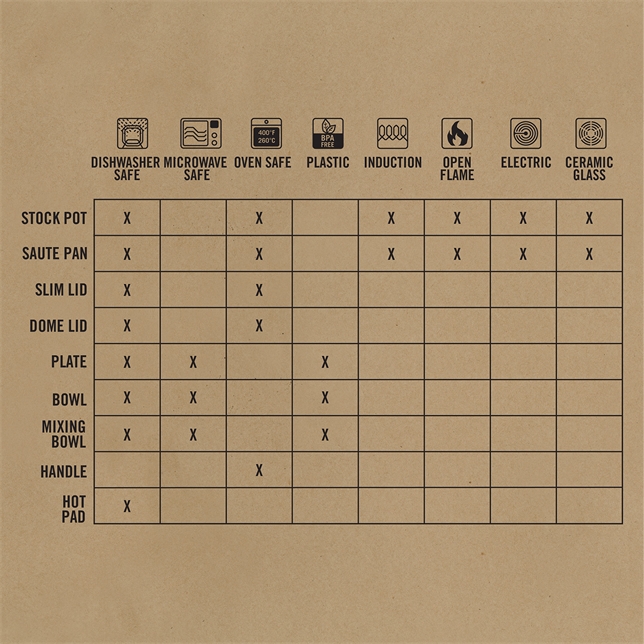 - Spülmaschinengeeignet: Sautépfanne, Kochtopf, Deckel, Teller, Schüsseln