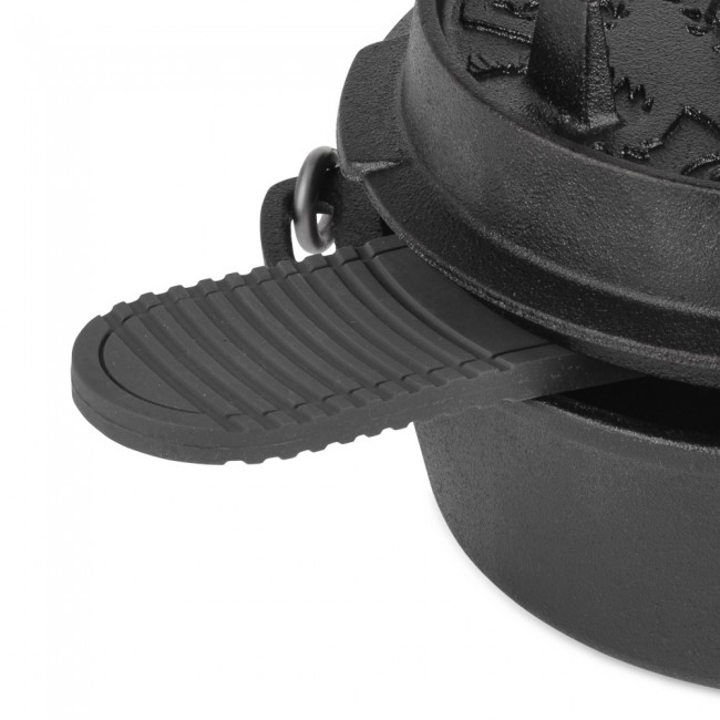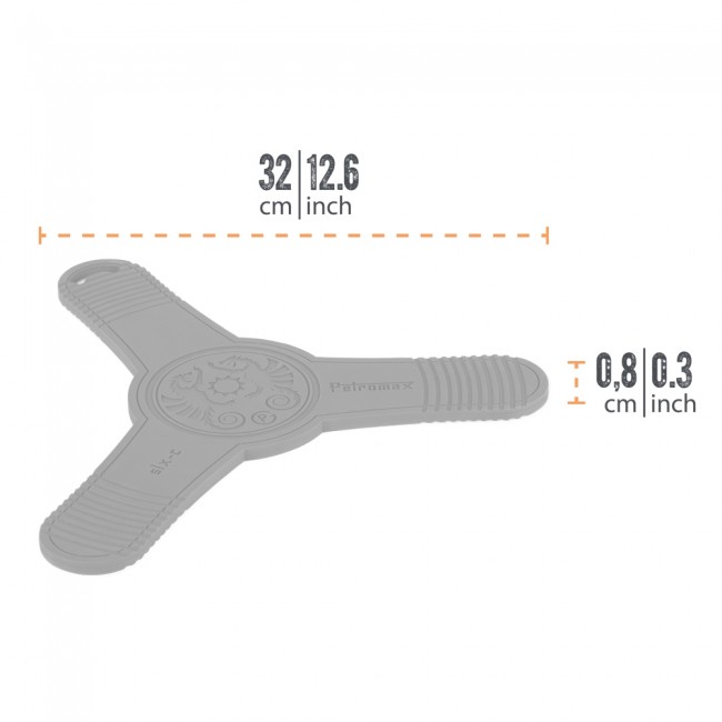 Der Petromax Silikonuntersetzer ist die rutschfeste Unterlage für alle Feuertöpfe und -pfannen. Auch der Deckel findet hier seinen zentralen Platz, wenn es im Feuertopf mal wieder heiss hergeht. Die gekrümmten Rillen deuten die verschiedenen Größen der Dutch Oven bereits an: Dank der Vertiefungen liegen die heissen Deckel unterschiedlicher Grösse sicher auf der Unterlage mit dem charakteristischen Drachenlogo. Die flexible Ablage in Form eines Bumerangs ist für die Feuertopfdeckel bis zum Modell ft9 geeignet.
