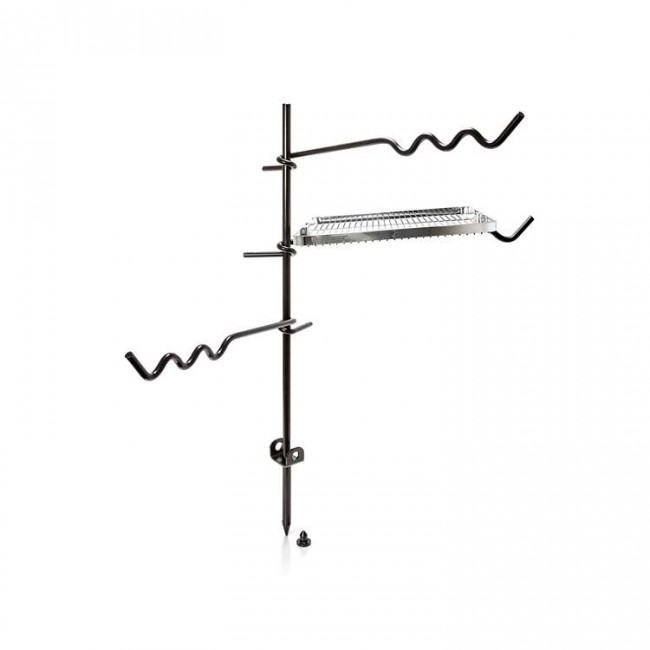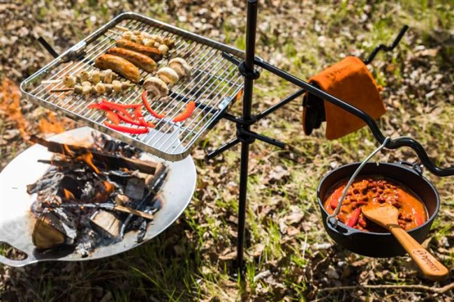 Der Feueranker verfügt über eine Hauptstange, die im Boden fixiert wird, und drei Arme, die individuell auf den Feueranker aufgesteckt und in Höhe sowie Ausrichtung variiert werden können. An zwei Armen befinden sich jeweils drei Einkerbungen, an die Kochgeschirr, wie der Feuertopf oder der Teekessel, sicher angehängt werden können. Der dritte Arm verfügt über einen Grillrost sowie eine zusätzliche Einkerbung für Grillhandschuhe oder die Grill- und Kohlenzange. Der großzügige Grillrost aus verchromtem Stahl hat einen erhöhten Rand, so dass das Grillgut sicher platziert werden kann.