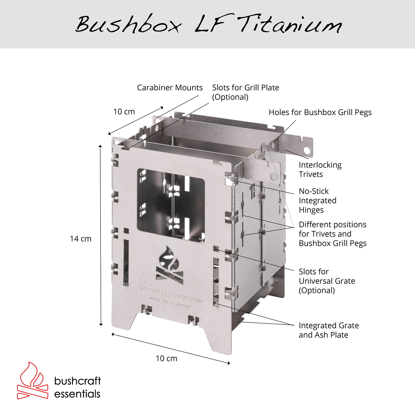 Wie alle Outdoor-Kocher von Bushcraft Essentials ist die Bushbox LF Titanium mehrstoff-fähig (Betrieb mit Holz, Esbit, Trangia etc. möglich) und in Deutschland hergestellt.