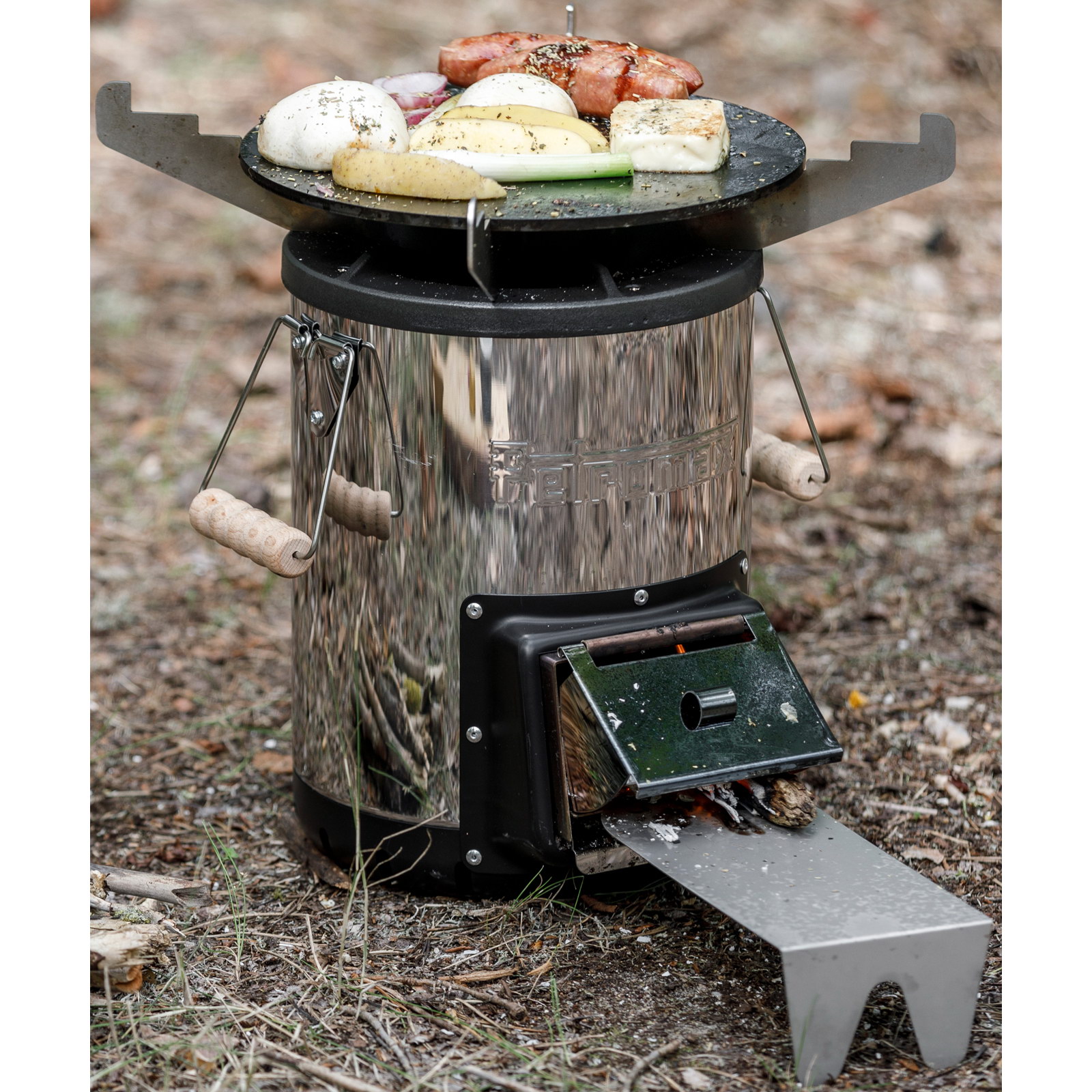 Während des Kochens kann der Raketenofen dank der vorderseitigen Brennkammerklappe und der Brennmaterialauflage leicht mit Brennstoff, wie z.B. Zweigen oder Tannenzapfen, versorgt werden, während Grillplatte und Kochkreuz auf dem Raketenofen verbleiben können.
