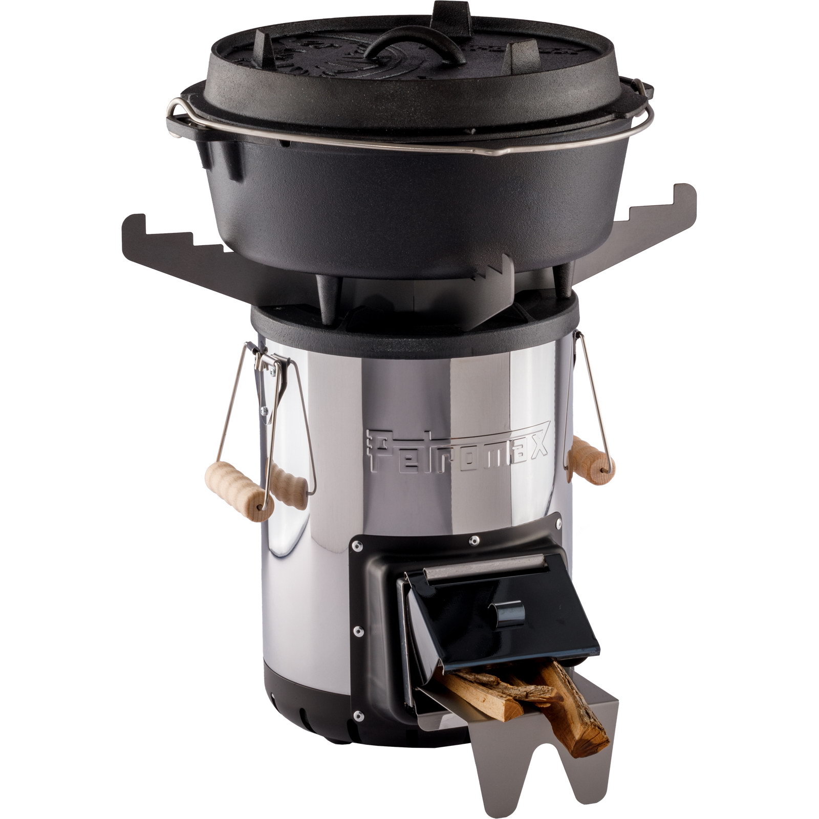 Der effiziente und kompakte Raketenofen kann nun mit noch mehr Petromax Kochgeschirr optimal kombiniert werden. Auf dem Kochkreuz finden Feuertöpfe mit Füßen (Dutch Oven) ebenso Platz wie Schmiedeeiserne Pfannen, Feuerpfannen, Perkolatoren oder die Feuerschale fs38. Deftiges Pfannengericht, Schichtkohl im Dutch Oven oder Kaffee im Perkolator – das passgenaue und vielseitige Kochkreuz der Grillplatte bringt Variabilität auf den Raketenofen.