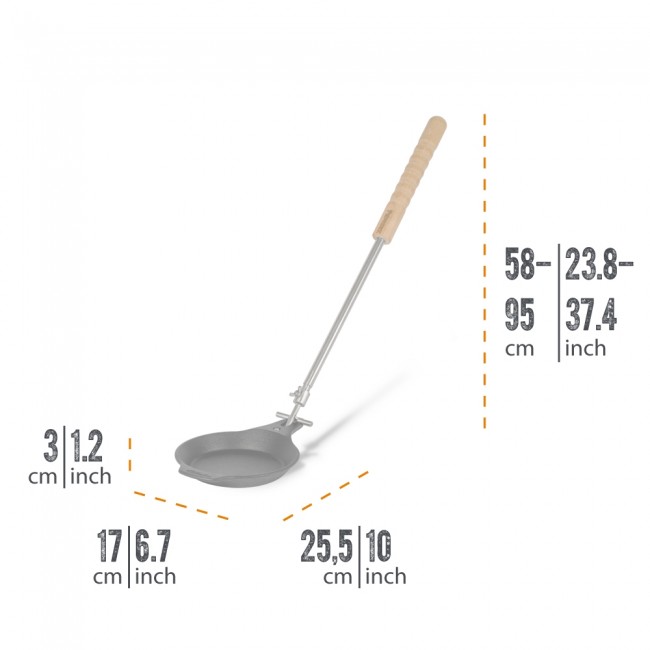 Der Teleskopgriff wird mühelos an der Lagerfeuerpfanne befestigt: So lässt sich die Pfanne mit dem optimalen Abstand zum Feuer sicher abstellen und leicht vom Teleskopgriff lösen. Der Handgriff aus Holz liegt sicher und bequem in der Hand, wodurch die volle Kontrolle über die Pfanne gegeben ist. Mit Hilfe der Flügelschraube kann die Länge des Griffs selbst eingestellt werden. Durch die Querstrebe bleibt die Pfanne gerade in ihrer Verankerung, sodass die Pfanne samt Inhalt sicher herausgehoben werden kann.